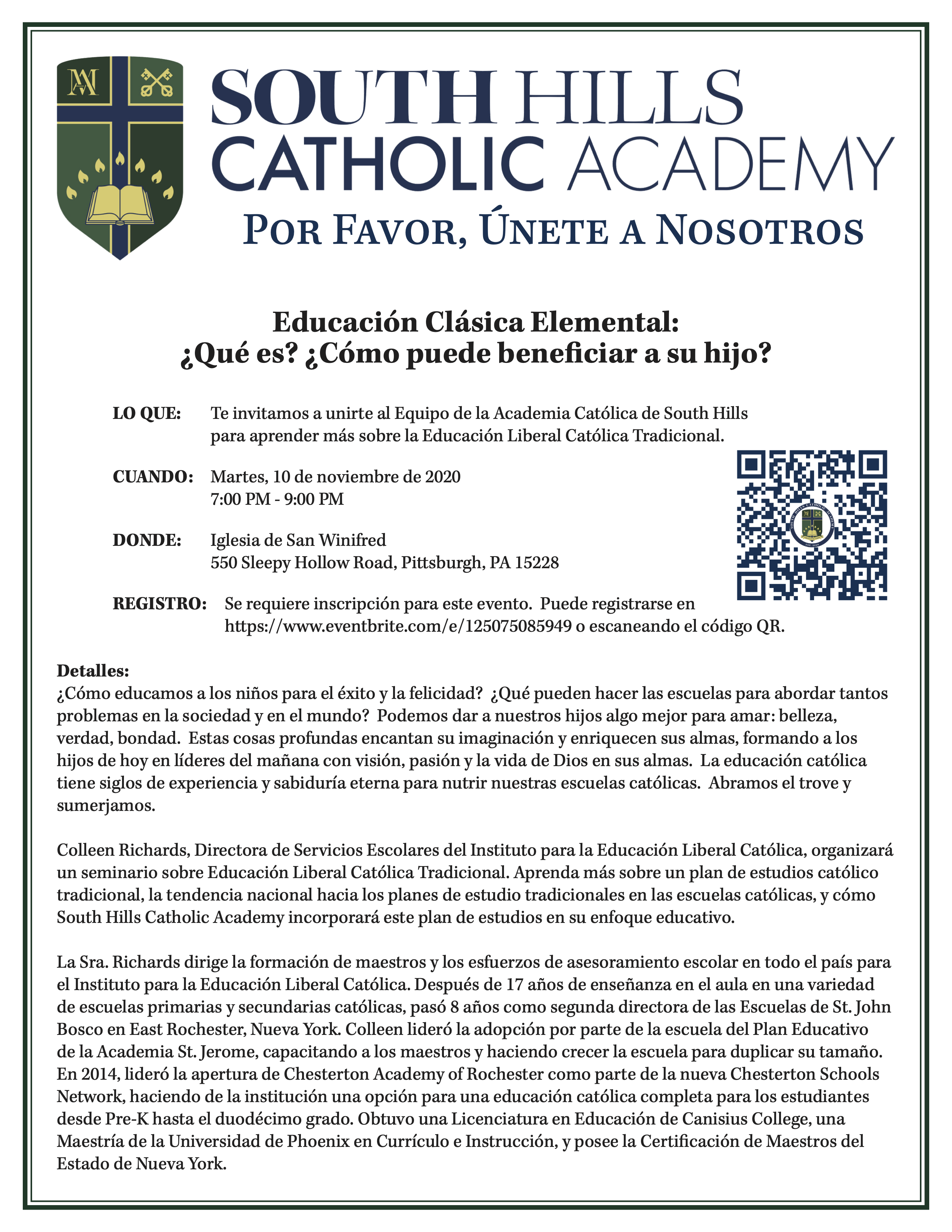 Para obtener información sobre nuestro seminario Educación Clásica Elemental: ¿Qué es? ¿Cómo puede beneficiar a su hijo? haga clic aquí.