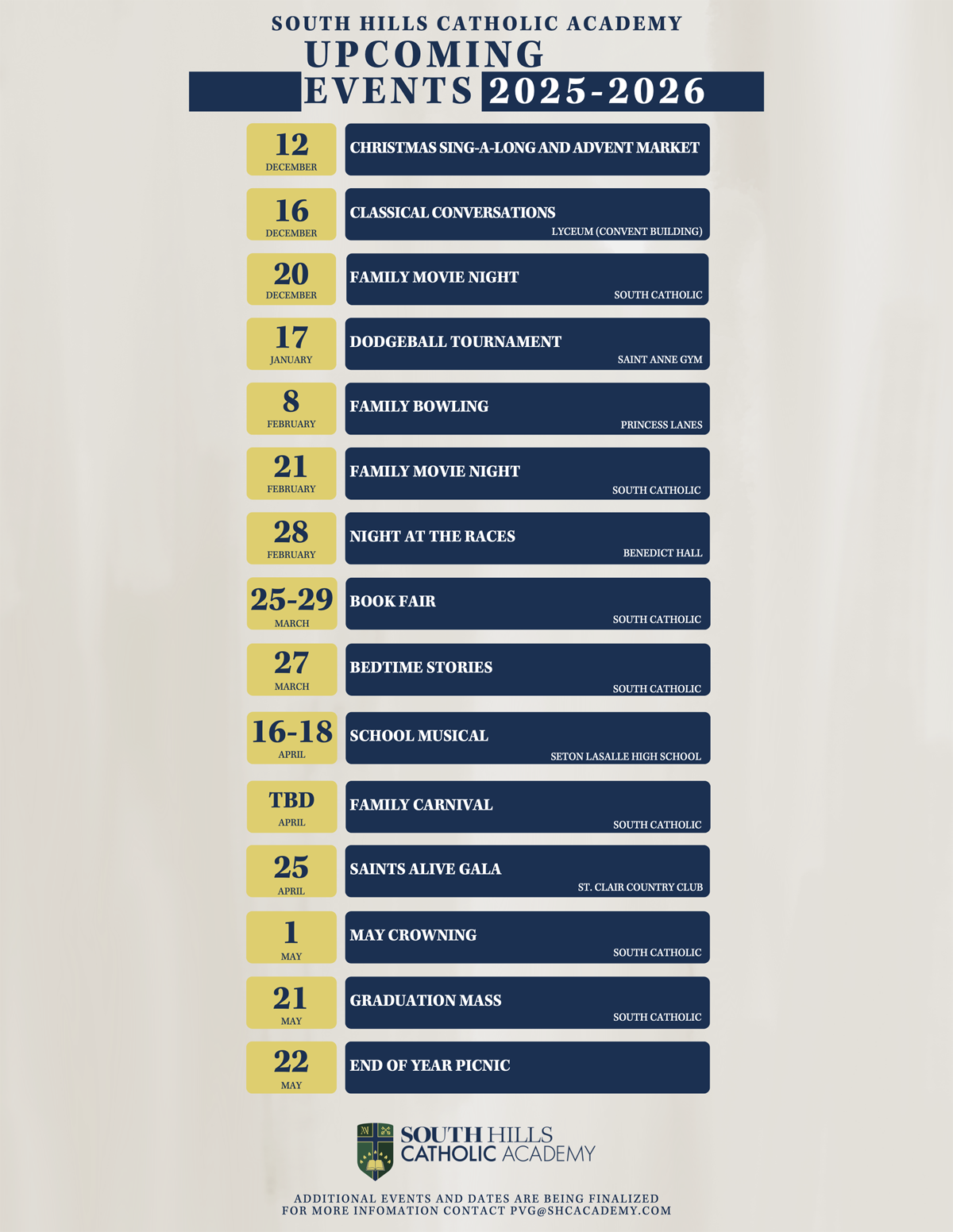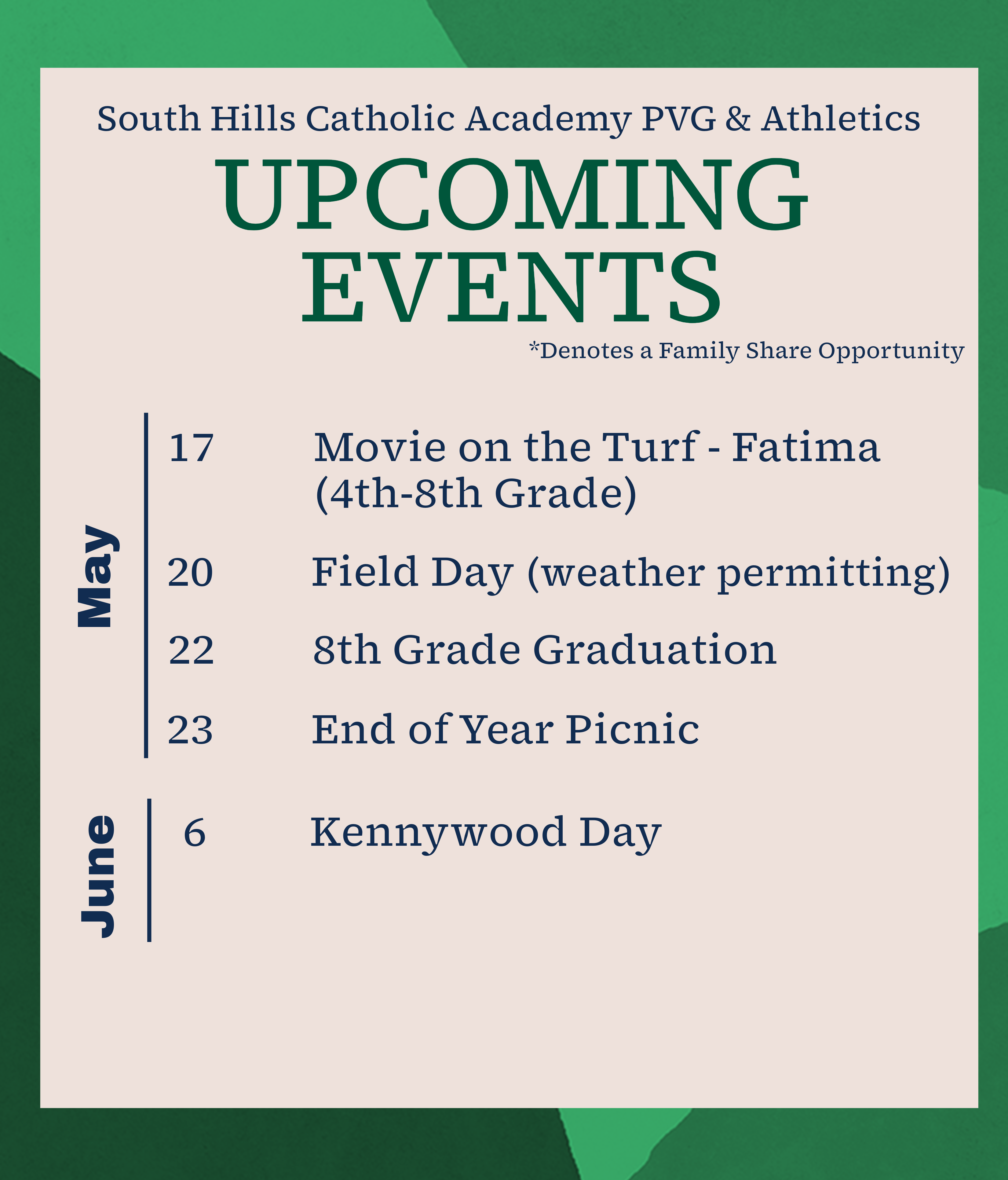 Your participation and support is necessary and much appreciated. We can positively make a difference in the day-to-day activities with our students, parents and teachers. There are many volunteer opportunities to fit the busy lives of today's families and everyone's contributions are valued. We want South Hills Catholic Academy to be a family centered place and invite you to get involved to make your child's experience here a happy and memorable one.